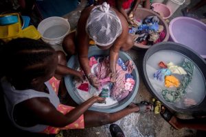 Fotografía de mujeres lavando ropa en el interior de una carpa en un campamento de refugiados, en Puerto Príncipe (EFE/Mentor David Lorens)
