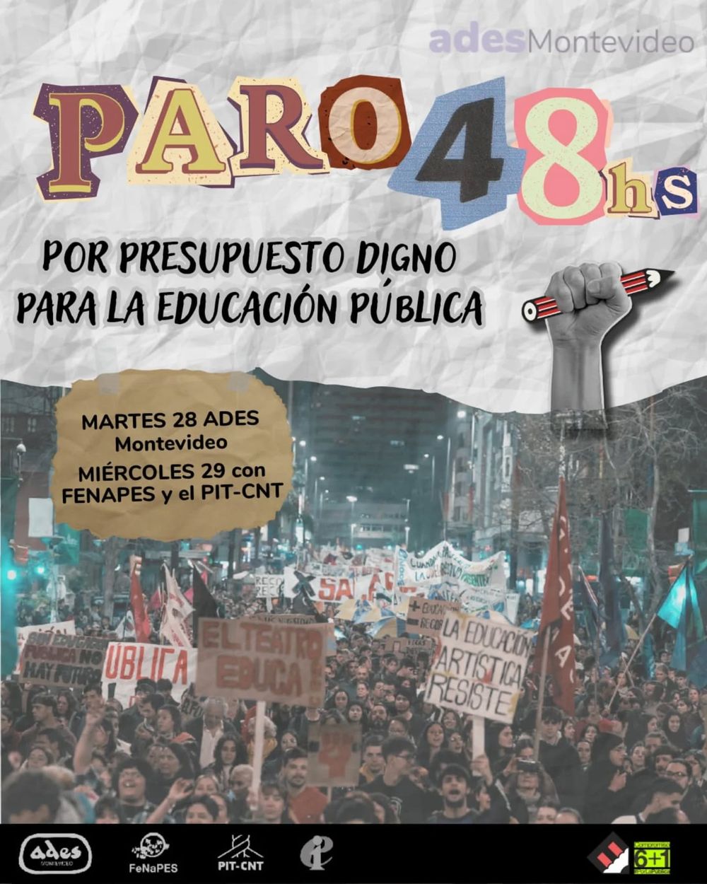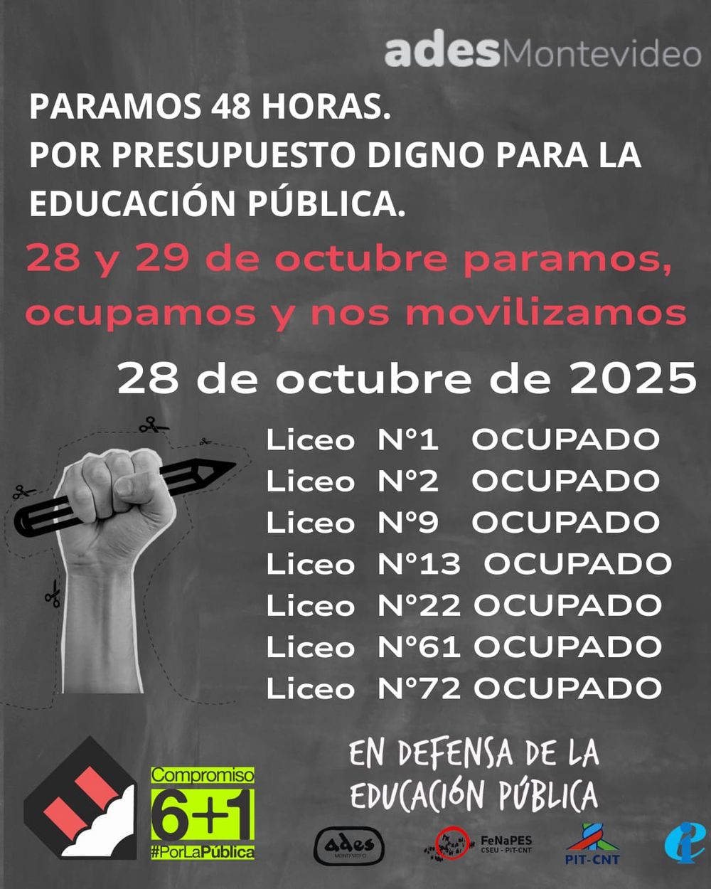 En el marco de la jornada de paro, ADES acompañará la ocupación del diferentes liceos de la capital.